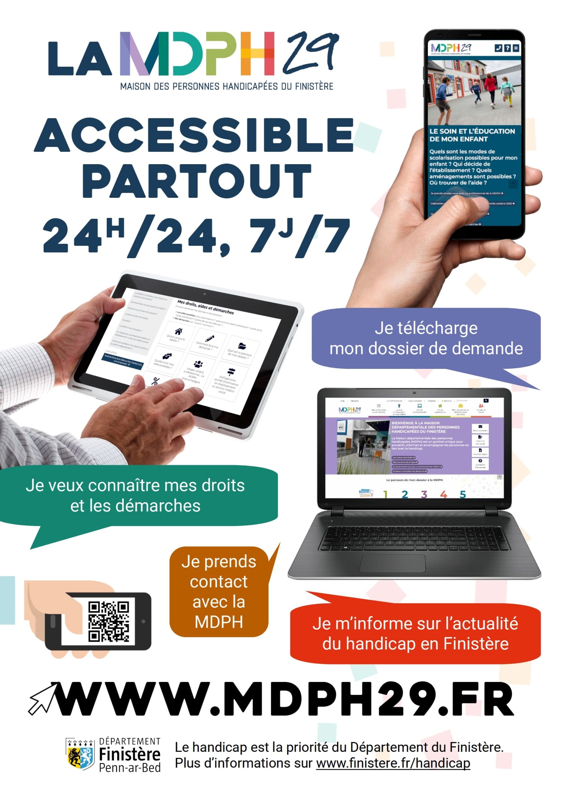 Le site de la MDPH29 permet de télécharger le dossier de demande de compensation du handicap, et de nombreux autres documents utiles. Son contenu est riche et régulièrement actualisé : il offre ainsi la possibilité aux usagers de s’informer de leurs droits et aides pour compenser leur handicap.