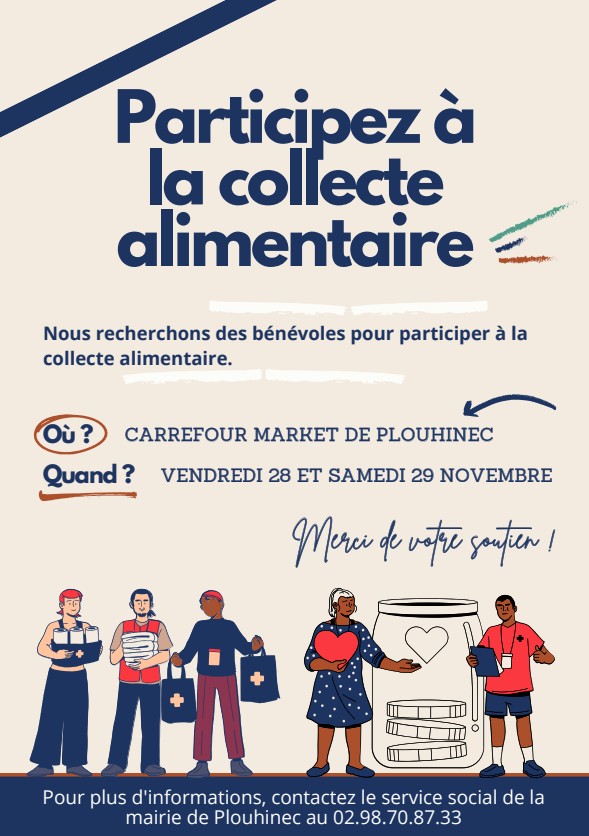 La collecte de la banque alimentaire aura lieu le vendredi 28 et samedi 29 novembre 2025, au Carrefour Market de Plouhinec.