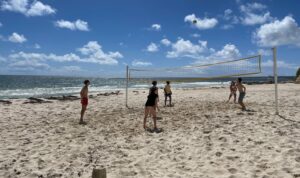 Durant la saison estivale, un filet de volley est installé sur la plage de Mesperleuc (côté parking principal).